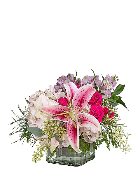Create a buzz. Always Bee You is a reminder that you are special and always present. Flowers like hydrangeas and a stargazer lily are uniquely arranged in this stunning cube.