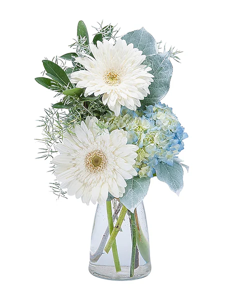 Soft blue and white blooms arranged in a clear vase for a simple misty look.