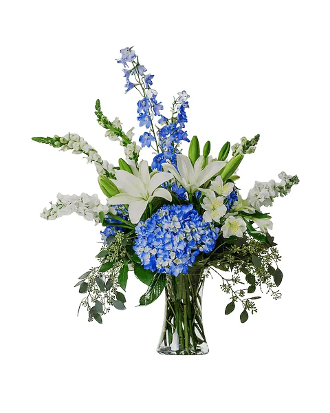 Surprise that someone special. Blue Moon will remind them they are in your thoughts always. A blue hydrangea is surrounded by Star of Bethlehem and lilies for a beautiful pick me up.