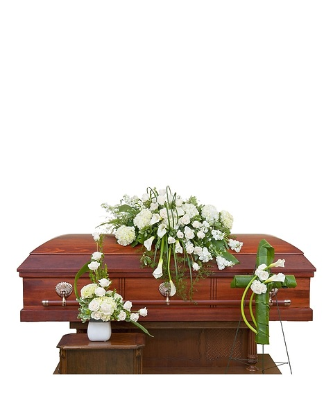 Elegant white casket spray, cross, and tribute.