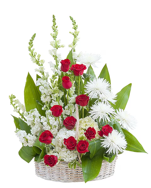 A basket filled with a variety of red and white flowers.