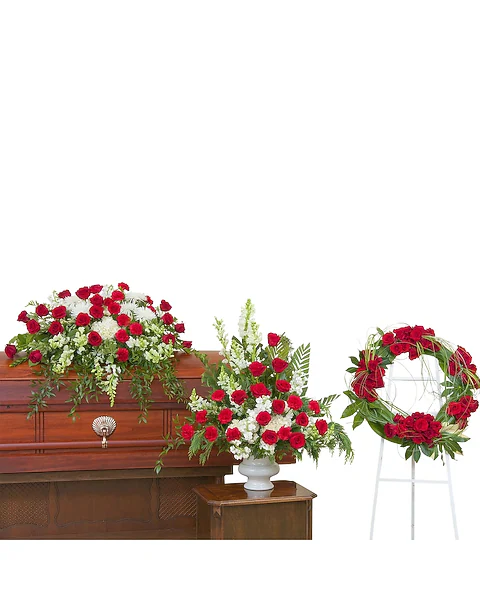 Red and white casket spray, urn and wreath.