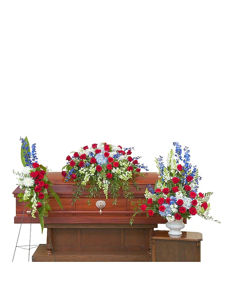 A patriotic casket spray, standing spray, and urn.