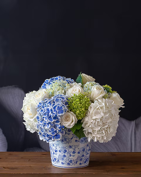 An attitude of quietude. Like your favorite love song, Perfect Harmony is a beautiful mix of tranquility and luxury. Flowers like hydrangeas refresh the senses in this arrangement in beautiful blues, greens and whites.